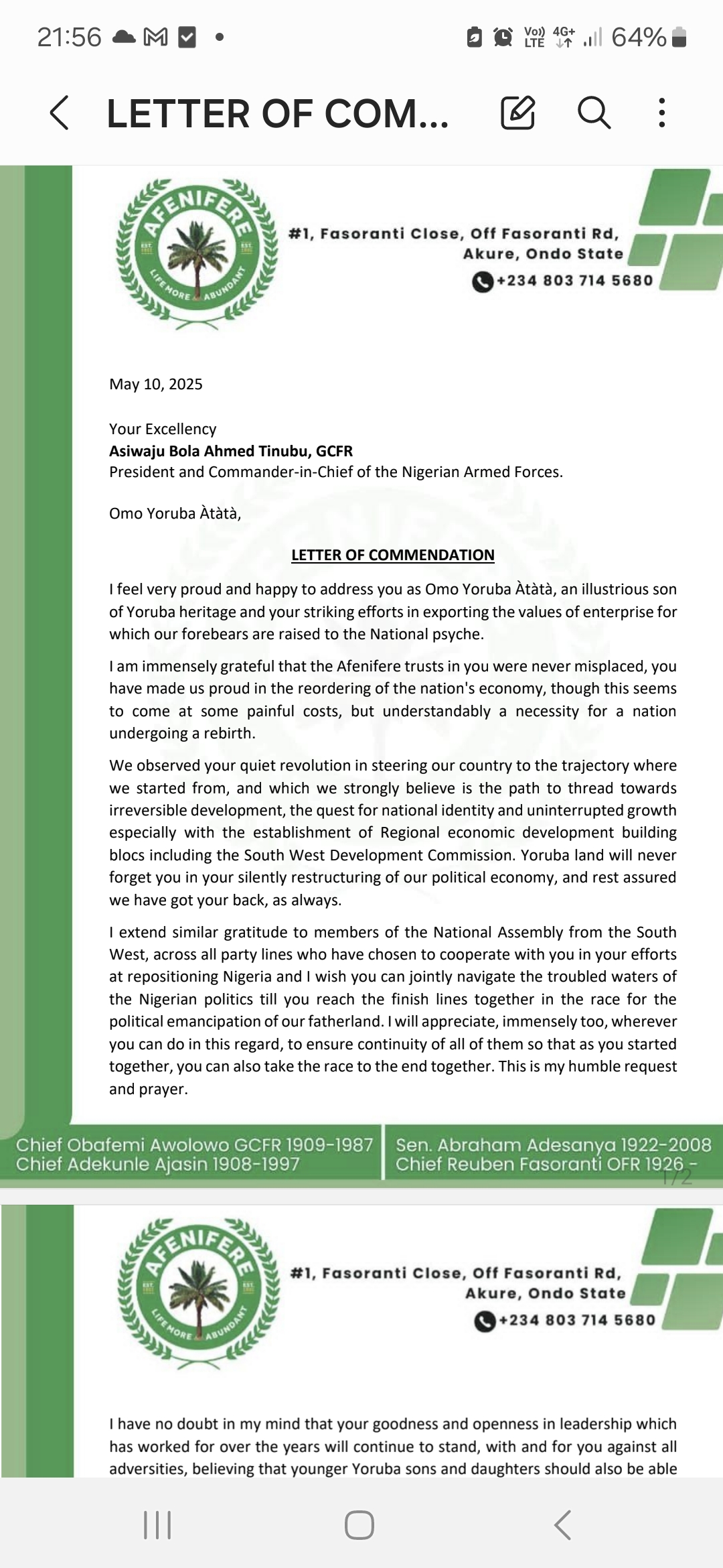 In a letter dated May 10, 2025 and addressed to Tinubu, the nonagenarian Asiwaju Yoruba said: “we have got your back, as always. I extend similar gratitude to members of the National Assembly from the South-West, across all party lines who have chosen to cooperate with you in your efforts at repositioning Nigeria”.