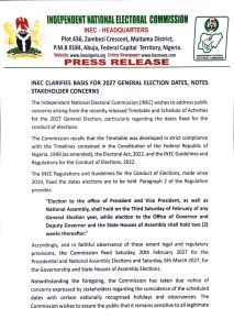 The Independent National Electoral Commission has addressed concerns over its recently released Timetable and Schedule of Activities for the 2027 General Election, particularly regarding the dates fixed for the conduct of the elections.