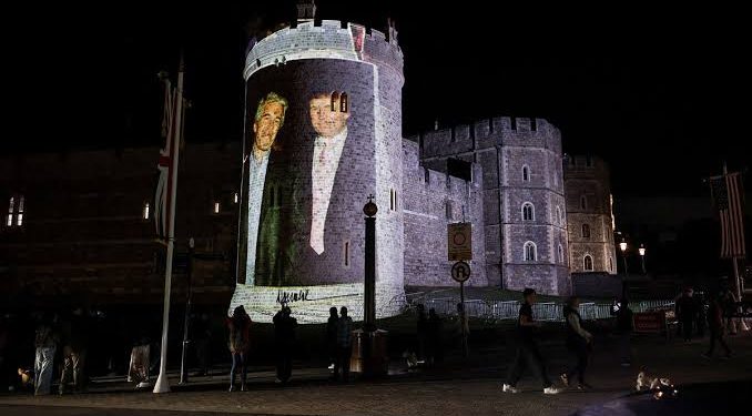 Four men who were arrested after images of Donald Trump with Jeffrey Epstein were projected on to Windsor Castle have been bailed, police said on Thursday.
