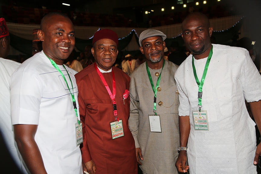 Abia State Governor and Senator-elect for Abia Central, Theodore Orji (second left), flanked by some House of Representatives Members-elect from Abia State (from left) Solomon Adaelu, Ossy Prestige and Darlington Nwokocha after the eighth National Assembly Induction Certificate Course at the International Conference Centre (ICC), Abuja.