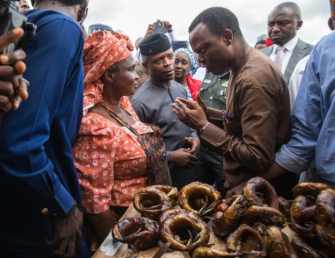 Acting President Yemi Osinbajo with a fish seller when he paid a surprise visit to Garki Market, Abuja…on Friday.