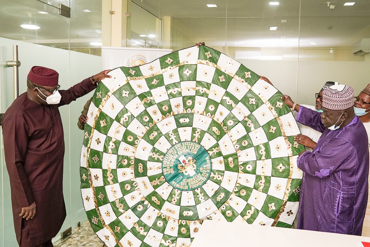 Chairman, Board of Trustees (BOT), Sir Ahmadu Bello Memorial Foundation and former Niger State Governor, Dr. Muazu Babangida Aliyu (right), making a presentation to Ekiti State Governor, Dr. Kayode Fayemi, during a visit by the leadership of the foundation to the governor in Ado-Ekiti…. on Monday.