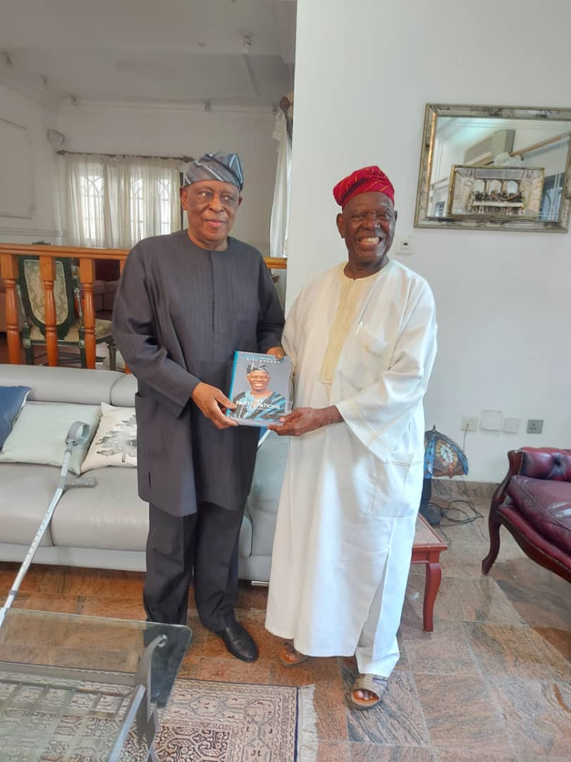 Former Governor of Osun State, Chief Bisi Akande (right), presenting his autobiography- My Participations – to former Ogun State Governor, Aremo Olusegun Osoba, when he visited Osoba at his Ikoyi, Lagos residence…on Friday.