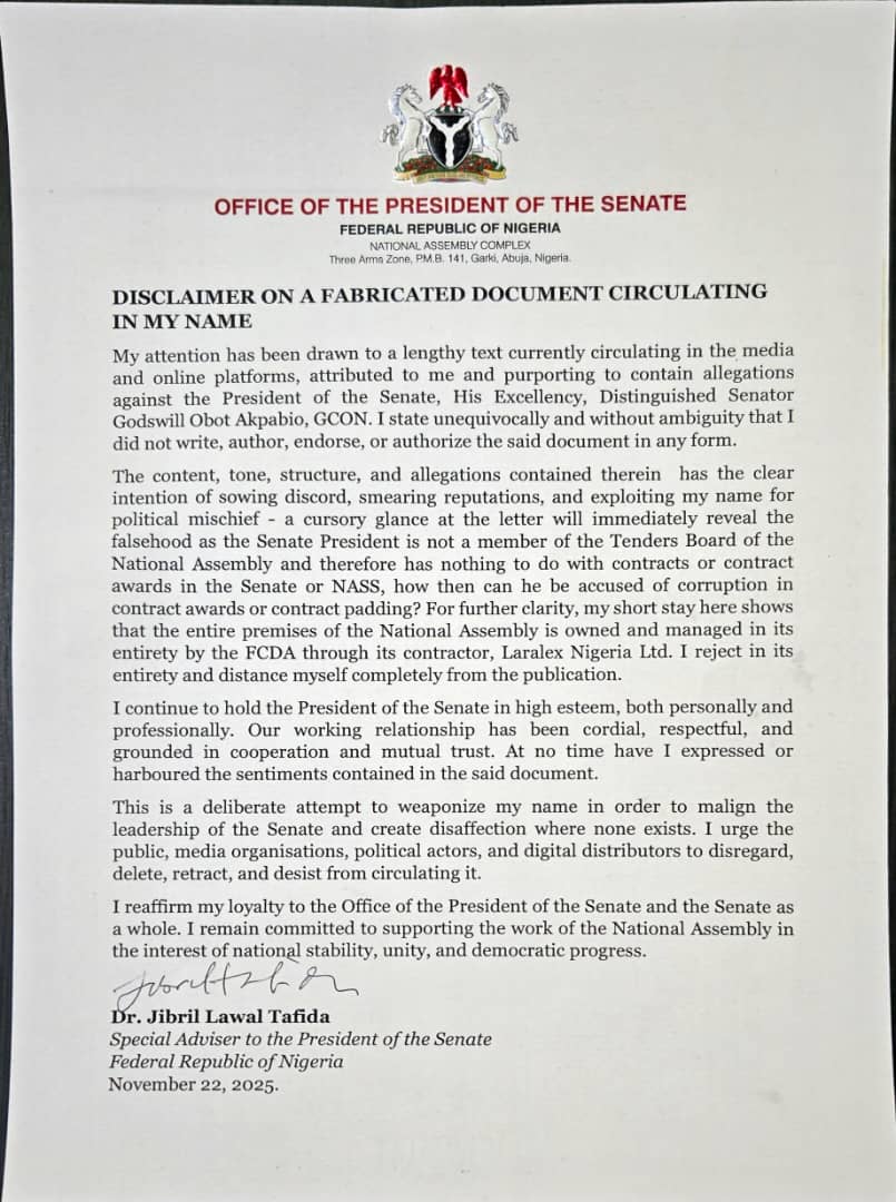 Dr Jibril Lawal Tafida, a Special Adviser to the Senate President, Senator Godswill Akpabio, has washed his hands off a damaging document against his principal, which was purportedly written by him.
