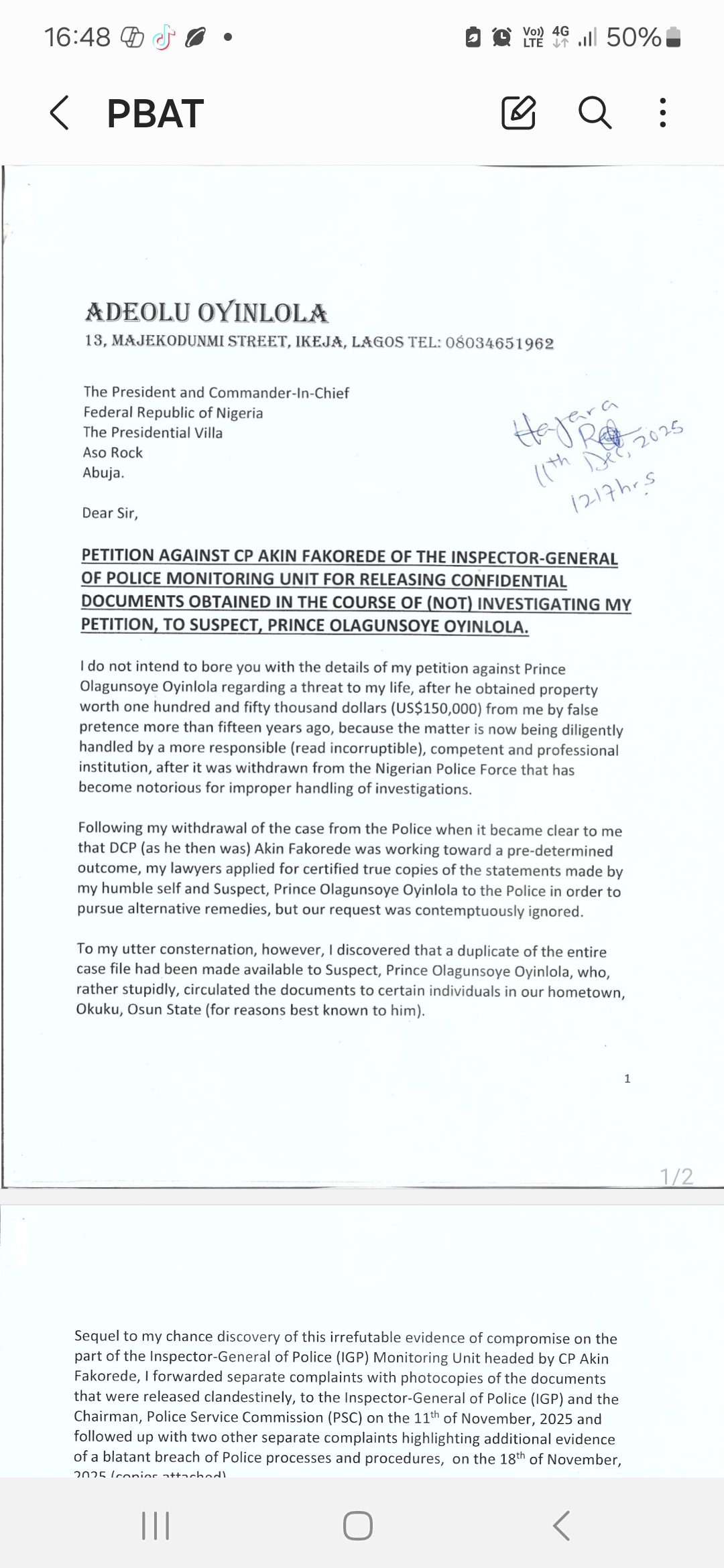 Sequel to my chance discovery of this irrefutable evidence of compromise on the part of the Inspector-General of Police (IGP) Monitoring Unit headed by CP Akin Fakorede, I forwarded separate complaints with photocopies of the documents that were released clandestinely, to the Inspector-General of Police (IGP) and the Chairman, Police Service Commission (PSC) on the 11th of November, 2025 and followed up with two other separate complaints highlighting additional evidence of a blatant breach of Police processes and procedures, on the 18th of November, 2025 (copies attached).