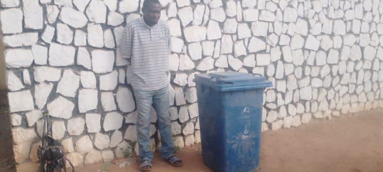 The suspect, according to the Commissioner, said that he concealed her body in a trash, filled the trash-can with cement and kept inside a locked store in the General Hospital Kaiama with the key in his procession.