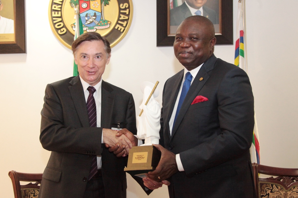 Governor Akinwunmi Ambode of Lagos State (right) presenting an eyo plaque to the Ambassador of France to Nigeria, Mr. Denys Gauer, during his courtesy visit to the governor at the Lagos House, Ikeja…on Wednesday.