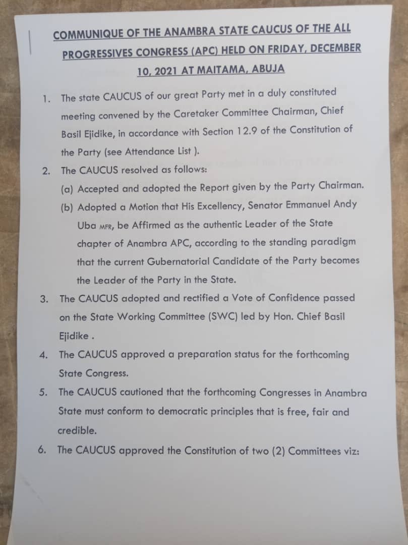 The State Caucus received briefing from Ejidike on the State of the Party in Anambra, and accepted and adopted the Report given by the Chairman. These included the suspension handed down to the former state secretary, Chukwuma Agufugo and erstwhile publicity secretary, Okelo Madukaife.
