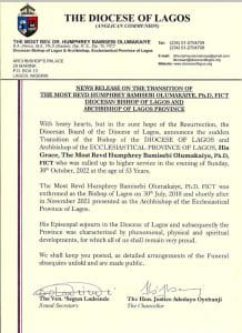 ”The pastoral and wise counsel of Archbishop Olumakaiye will be sorely missed by his family, the House of Bishop, clergies and the laity.
