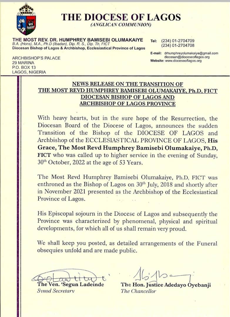 ”I pray that God will grant the late Archbishop Olumakaiye eternal rest and grant the family and the church the fortitude to bear the irreparable loss,” Sanwo-Olu said.