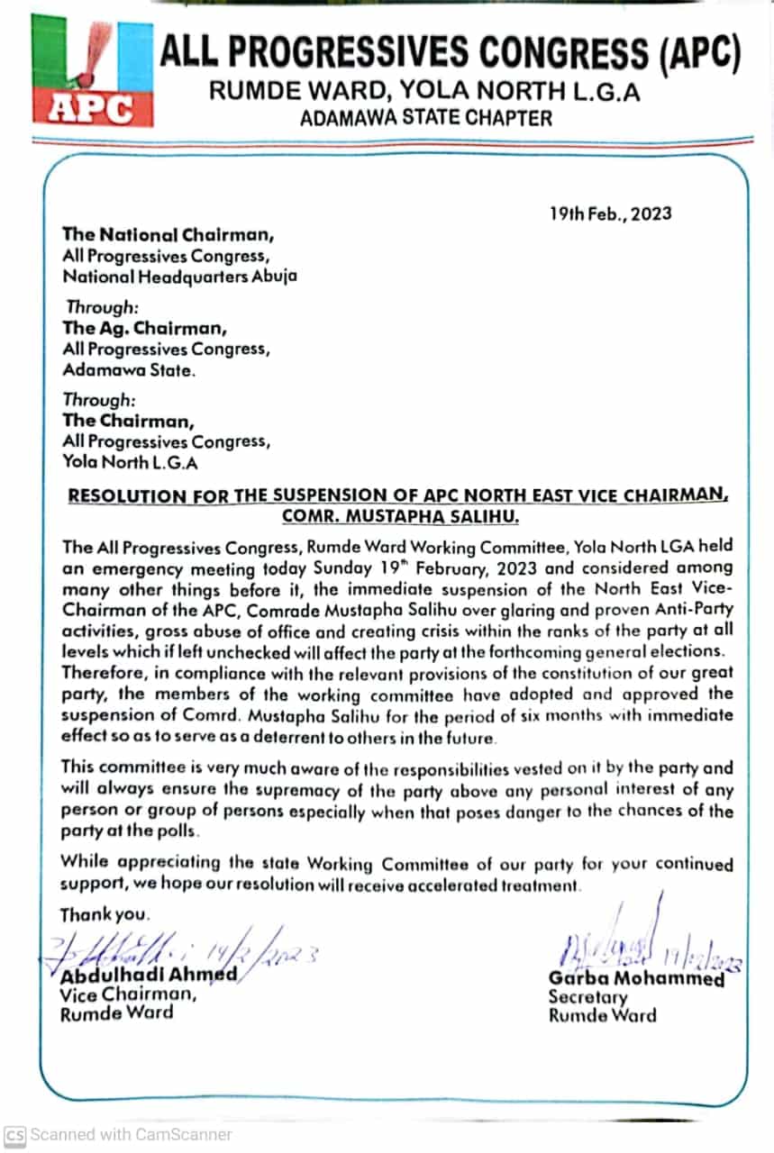 Salihu’s suspension letter reads: “The All Progressives Congress, Rumde Ward Working Committee, Yola North Local Government Area(LGA) held an emergency meeting on Sunday 19” February, 2023 and considered among many other things before it, the immediate suspension of the North-East Vice Chairman of the APC, Comrade Mustapha Salihu over glaring and proven anti-party activities, gross abuse of office and creating crisis within the ranks of the party at all levels which if left unchecked will affect the party at the forthcoming general elections.