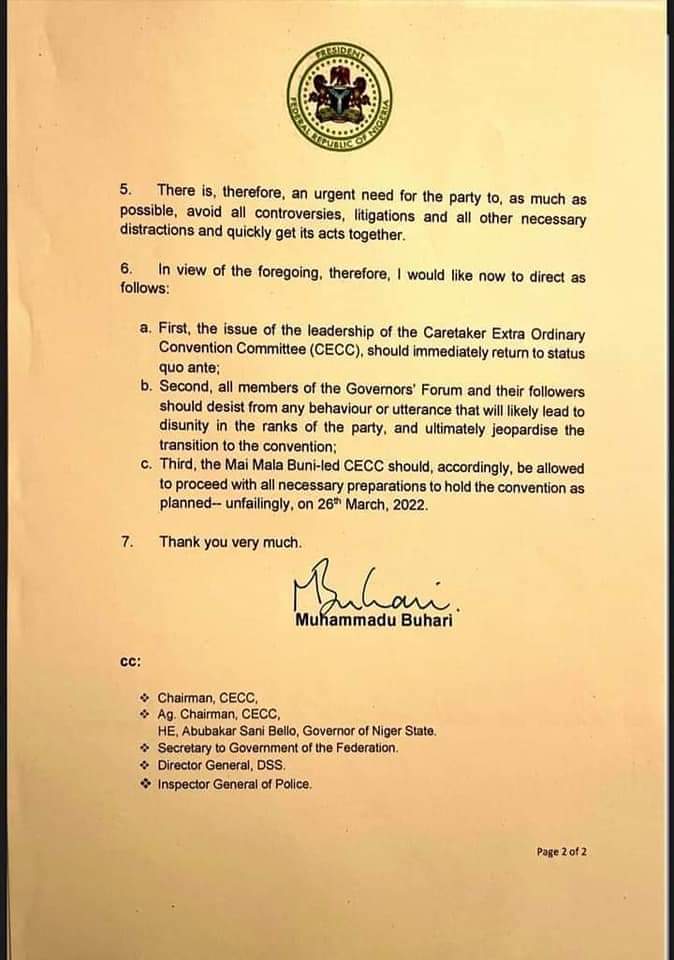 The letter was also copied to the Chairman of Caretaker Extraordinary Convention Committee (CECC), the Acting Chairman of the CECC, Gov. Sani Bello, the Director General of the DSS as well as the Inspector General of Police.