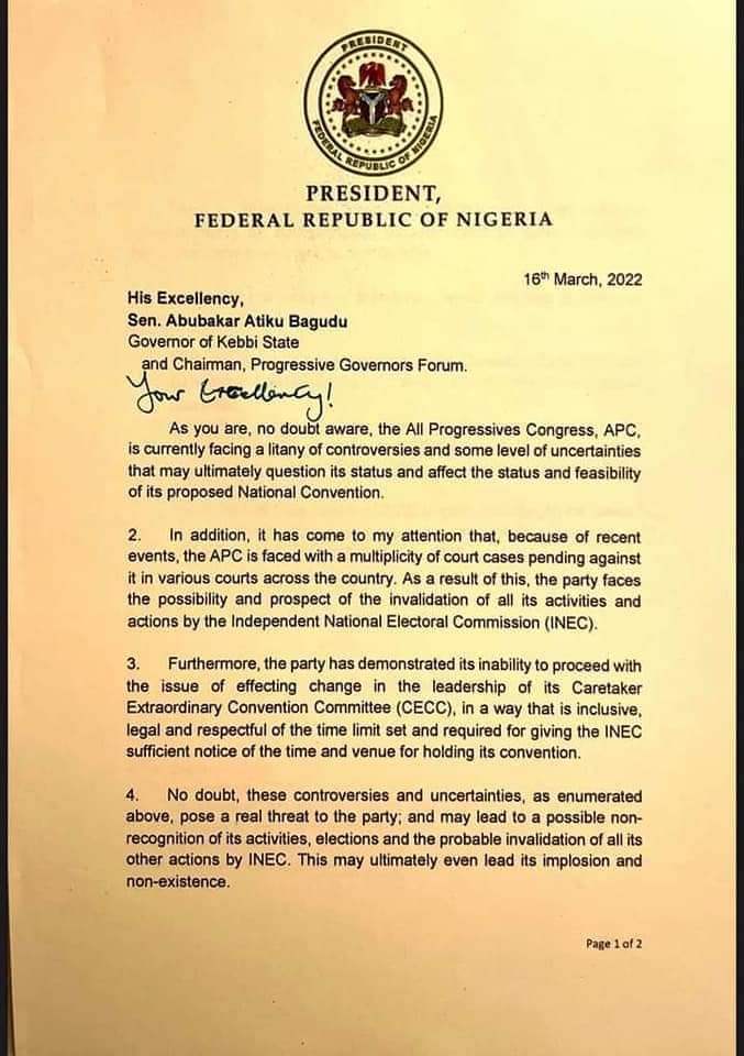 In the letter, the president said the multiplicity of cases currently rocking the party had the prospect of invalidating the activities and actions of the party by the Independent National Electoral Commission (INEC).