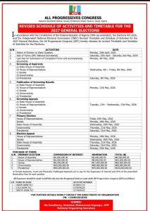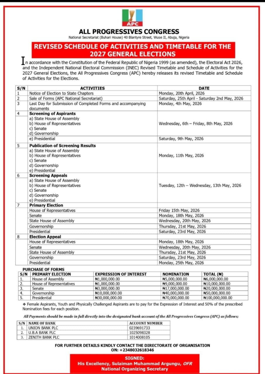 The All Progressives Congress has released a revised timetable and schedule of activities for the 2027 general elections, adjusting timelines for screening, primaries, appeals, and related internal party processes, while also publishing designated bank accounts for the purchase of Expression of Interest and Nomination forms.