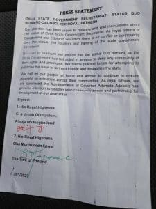 Our attention has been drawn to rumours and wild insinuations about the status of Osun State Government Secretariat. As royal fathers of Osogboland and Edeland, we affirm there is no conflict or controversy over the status, the location and naming of the state government Secretariat.