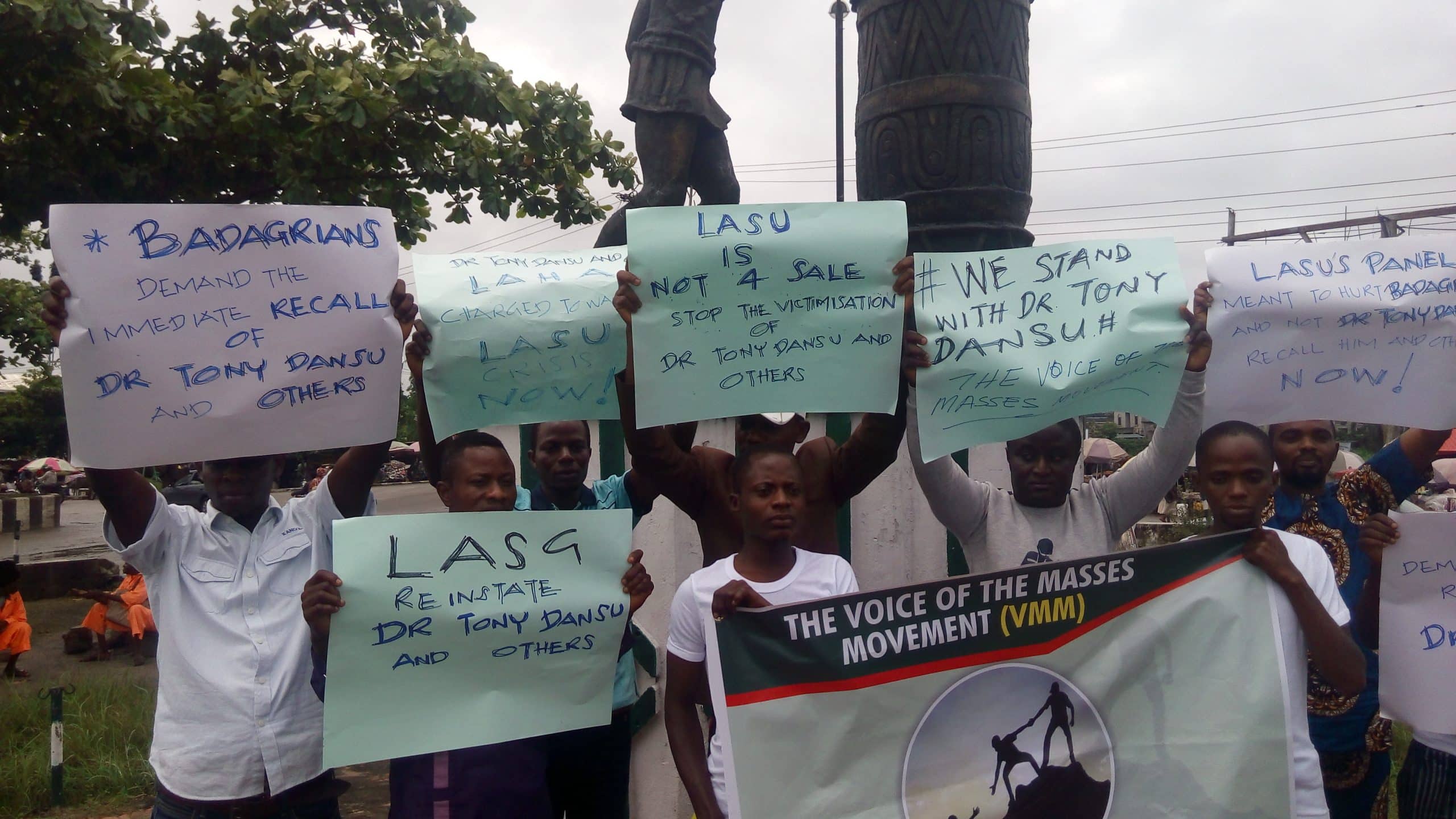 Some youths, under the auspices of the Voice Movement of the Masses (VMM), an NGO, on Friday staged a peaceful protest in Badagry against the sack of Dr Tony Dansu, an indigene, from the Lagos State University, Ojo.