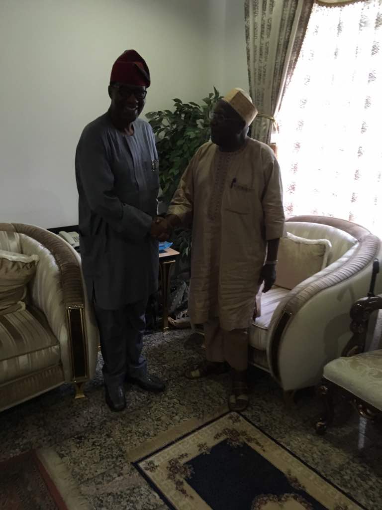 Former Ogun State Governor, Otunba Gbenga Daniel (left) with former National Chairman of the Peoples Democratic Party (PDP), Alhaji Bamanga Tukur, when he visited Tukur in Abuja. Daniel is contesting for the office of the national chairman of the party in the December 9 national convention in Abuja.