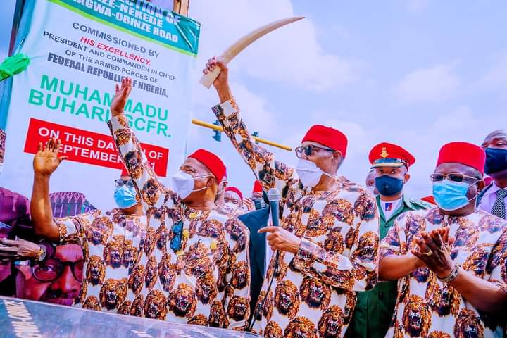 The president, among others, inaugurated First Phase of Naze/Nekede/Ihiagwa/Obinze link road, Balloon Driven/Flood Control Tunnel and Egheada Bypass road.