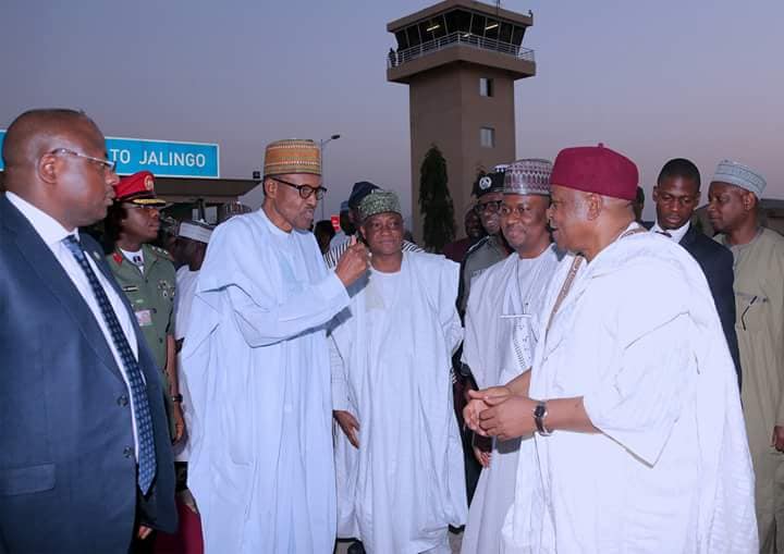 President Muhammadu Buhari discussing with Governor Darius Ishaku of Taraba State during the president’s visit to the North-East state…on Monday.