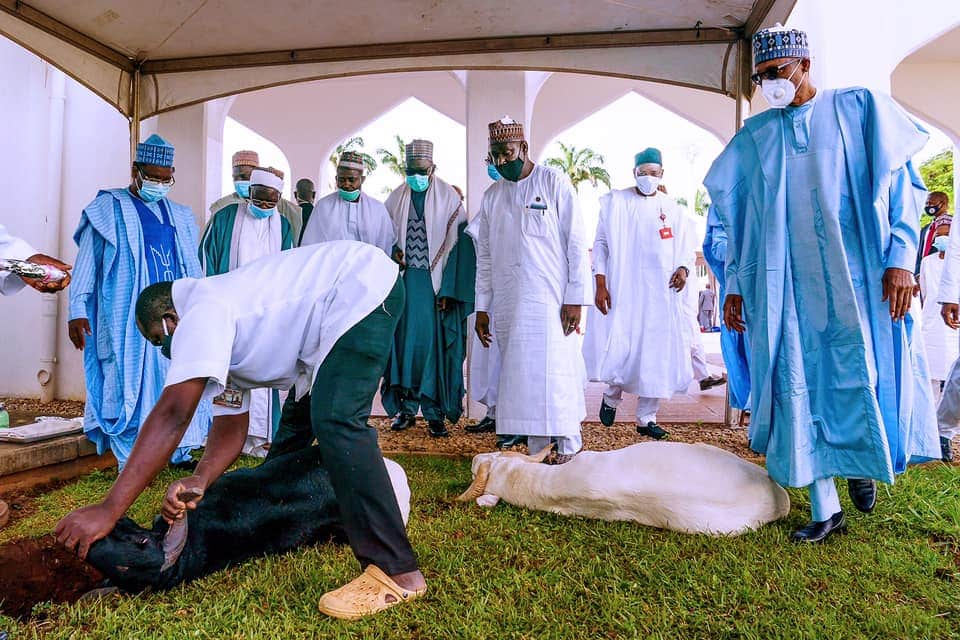The president, after the prayer, personally slaughtered his own ram in accordance with Islamic injunctions.