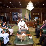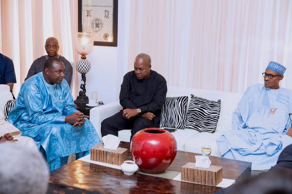 President Muhammadu Buhari (right), President John Dramani Mahama of Ghana and President-Elect of Islamic Republic of Gambia, Adama Barrow, during their meeting with Barrow in Banjul…on Tuesday.