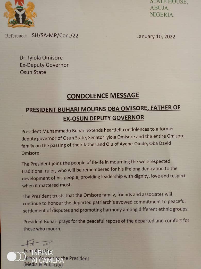 President Muhammadu Buhari extends heartfelt condolences to a former deputy governor of Osun State, Senator Iyiola Omisore, and the entire Omisore family on the passing of their father and Olu of Ayepe-Olode, Oba David Omisore.