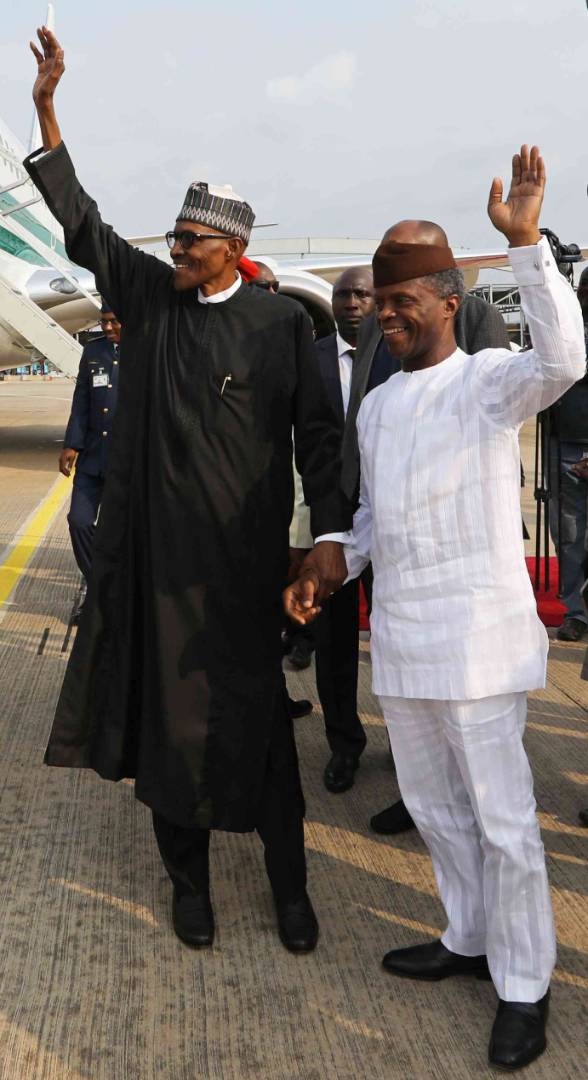President Muhammadu Buhari (left) holding Vice President Yemi Osinbajo shortly after the president’s arrival from London at the Nnamdi Azikiwe International Airport, Abuja…on Saturday.
