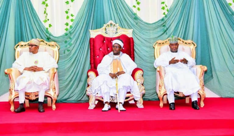 L-R: President Muhammadu Buhari; Ohinoyi, the Ohi of Okengwe, Alhaji Mohammed Anaje, rep of Ohi of Ebiraland, Dr Ado Ibrahim; and Governor Yahaya Bello of Kogi State, during the townhall meeting & inauguration of the new Ohinoyi’s Palace in Okene…on Thursday.