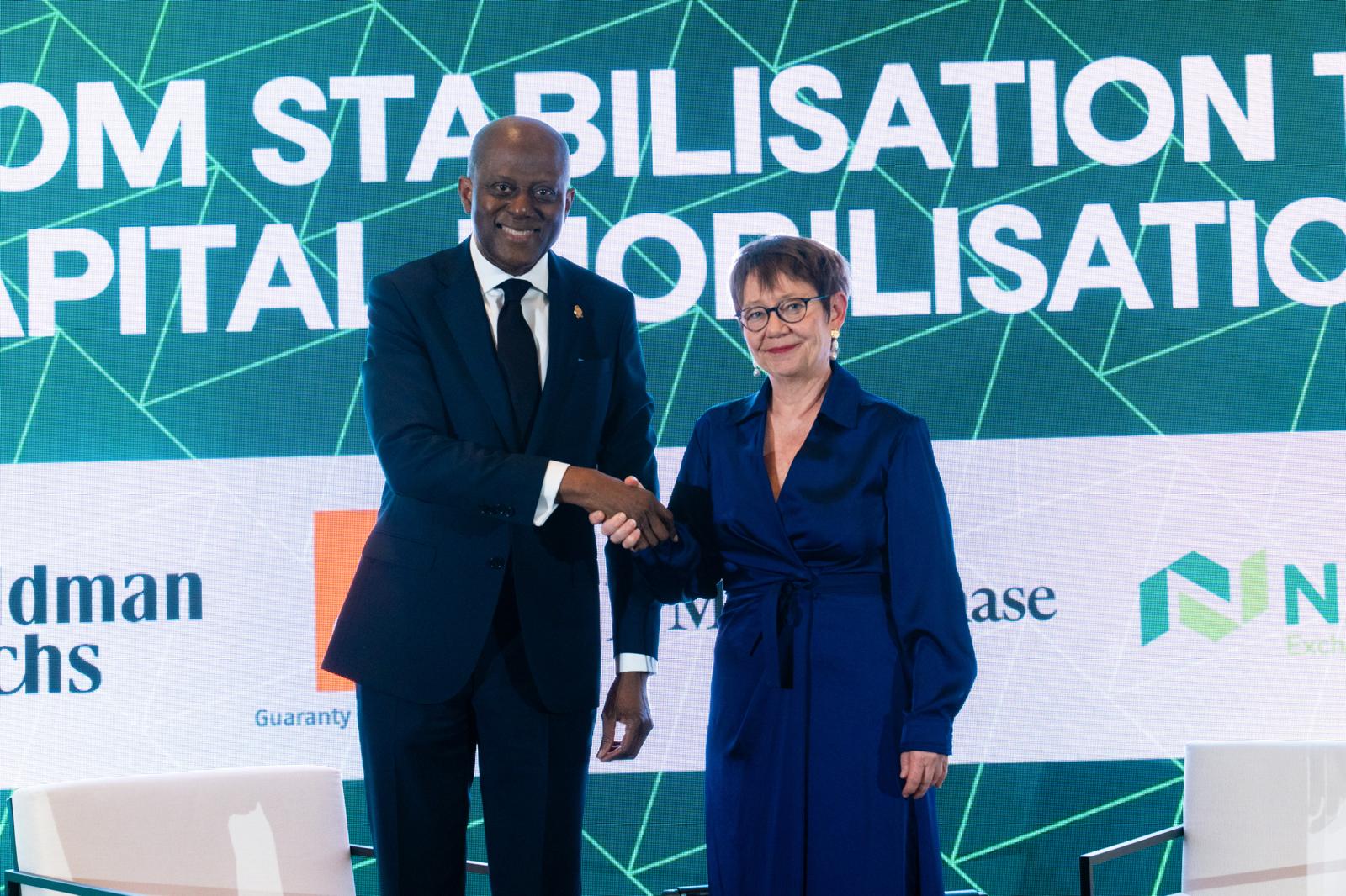 Governor of the Central Bank of Nigeria (CBN), Olayemi Cardoso (left) and President, European Bank for Reconstruction and Development (EBRD), Odile Renaud-Basso, at the Africa Capital Forum (convened under the theme ‘From Stabilisation to Capital Mobilisation’) at the Peninsula, London…on Tuesday.