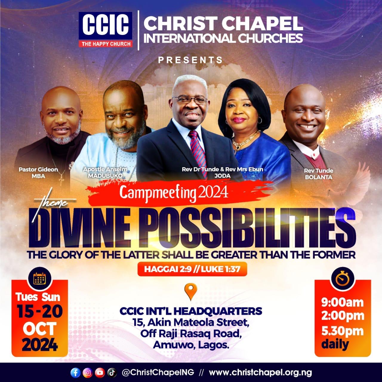 The 2024 annual camp meeting of Christ Chapel International Churches, CCIC, is scheduled to commence on Tuesday, October 15, and end on Sunday, October 20.