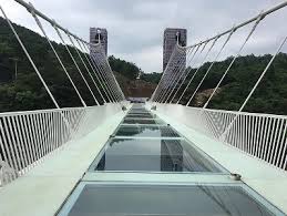The 430-meter long, six-meter wide bridge, paved with 99 panes of three-layer transparent glasses, hangs between two steep cliffs 300 meters above the ground.