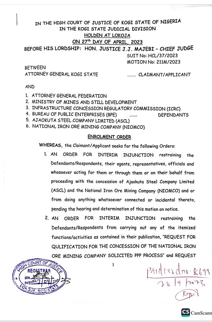 A Kogi State High Court sitting in Lokoja, the state capital, has ordered the Federal Government to desist from proceeding with the concession of the Ajaokuta Steel Company Limited (ASCL) and the National Iron Ore Mining Company (NIOMCO) at Itakpe.