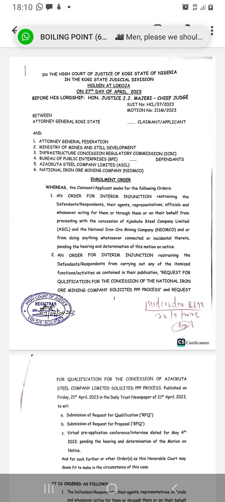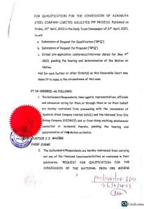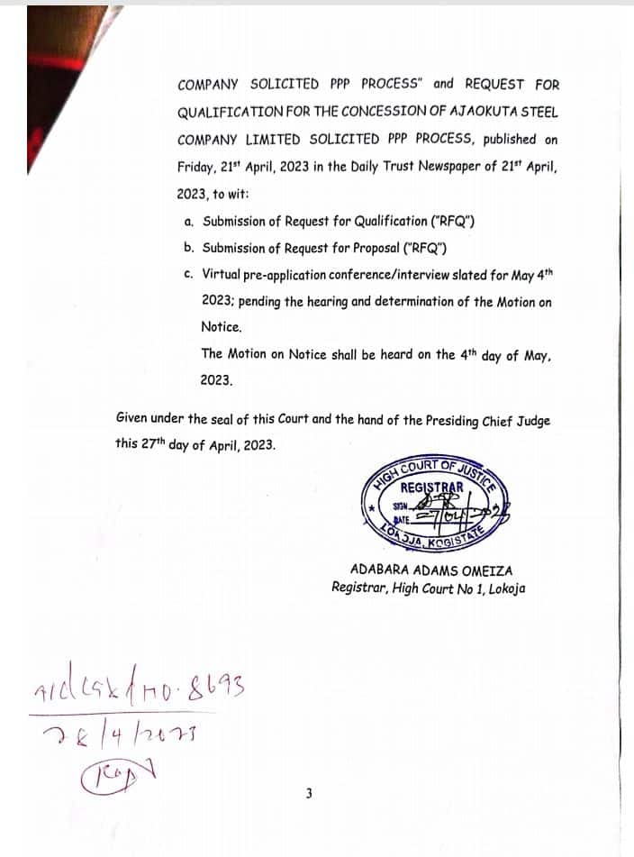 “The Defendants/Respondents are hereby restrained from carrying out any of the itemized functions/activities as contained in their publication, ‘Request for the Qualification for the Concession of the National Iron Ore Mining Company Solicited PPP Process’ and ‘Request for Qualification for the Concession of Ajaokuta Steel Company Limited Solicited PPP Process’ published on Friday, 21st April, 2023 in the Daily Trust Newspaper of Friday, 21st April, 2023′ to wit: Submission of Request for Qualification (RFQ), Submission of Request for Proposal (RFP), virtual pre-application conference interview slated for May 4th, 2023; pending the hearing and determination of the Motion on Notice. The Motion on Notice shall be heard on 4th day of May, 2023.”