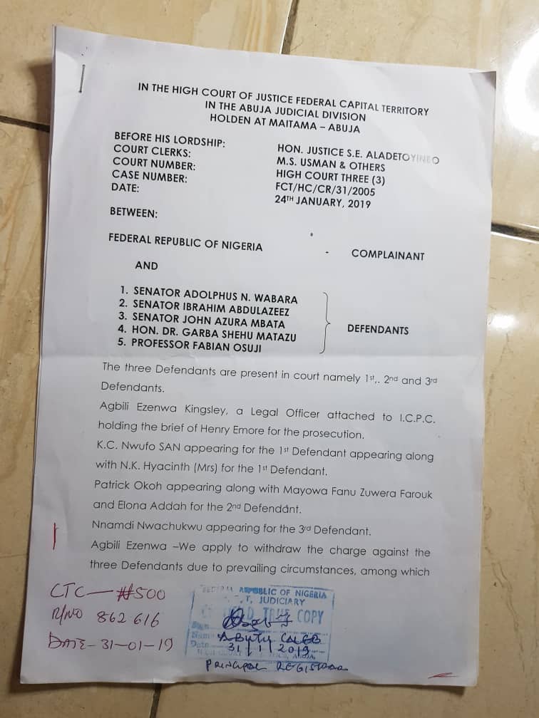 Two other defendants, who were listed in the suit, Hon. Garba Matazu and Professor Fabian Osuji, were not present in the court, in a suit filed by the Independent Corrupt Practices and other related offences Commission (ICPC).