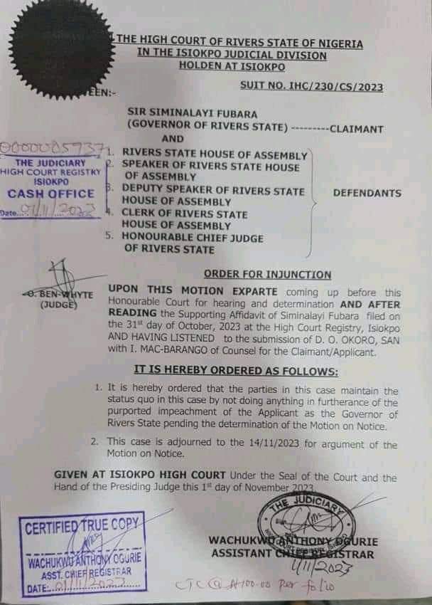A Rivers State High Court of Isiokpo Division, on Wednesday, issued an interim injunction, restraining the state House of Assembly and the Speaker, Martin Amaewhule, from impeaching Governor Siminalaye Fubara.