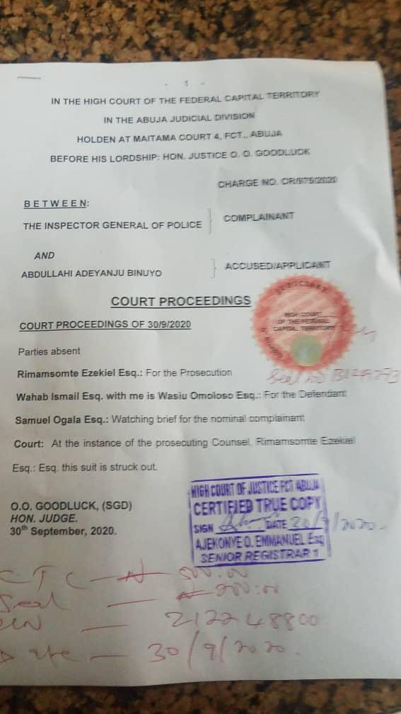 The Inspector General of Police had in a charge marked CR/975/2020 sued Binuyo before the Court.