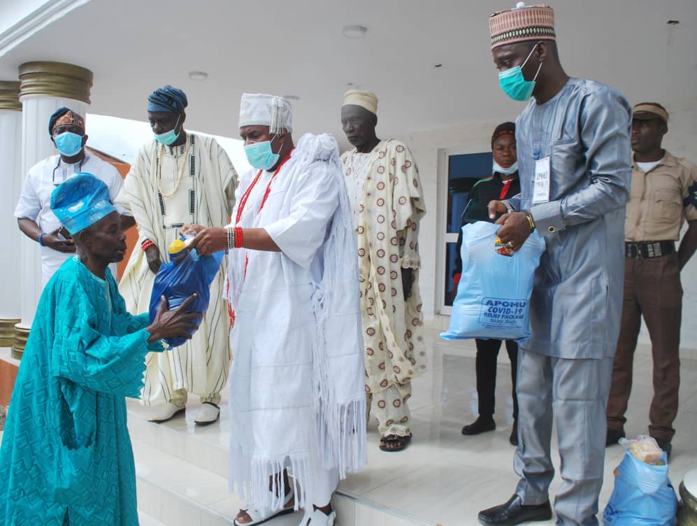 Oba Kayode Adenekan Afolabi, the Alapomu of Apomu, has kick started the distribution of food materials in Apomu, headquarters of Isokan local government, State of Osun.