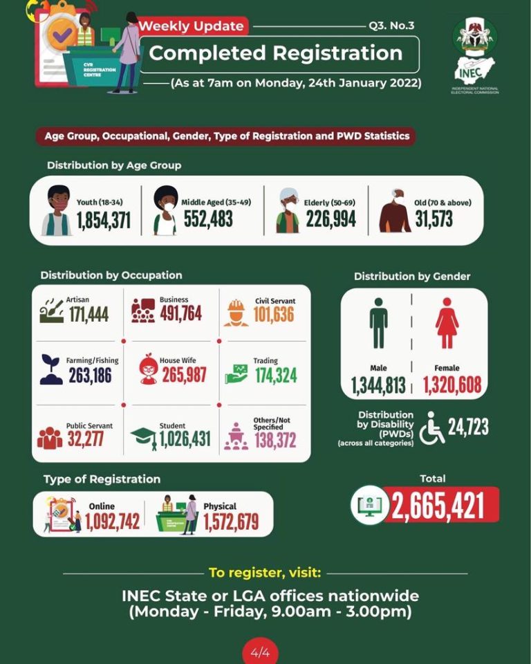 INEC, in its weekly update on CVR for Quarter 3, Week 3, in Abuja on Monday, also disclosed that 2,665,421 registrants had completed online and physical registration.