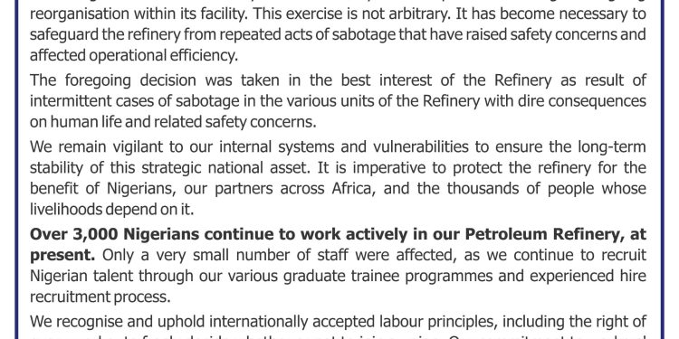 The refinery described the allegation as both unfounded and misleading, noting that the re-organisation within its workforce was aimed at strengthening operations and addressing repeated acts of sabotage.
