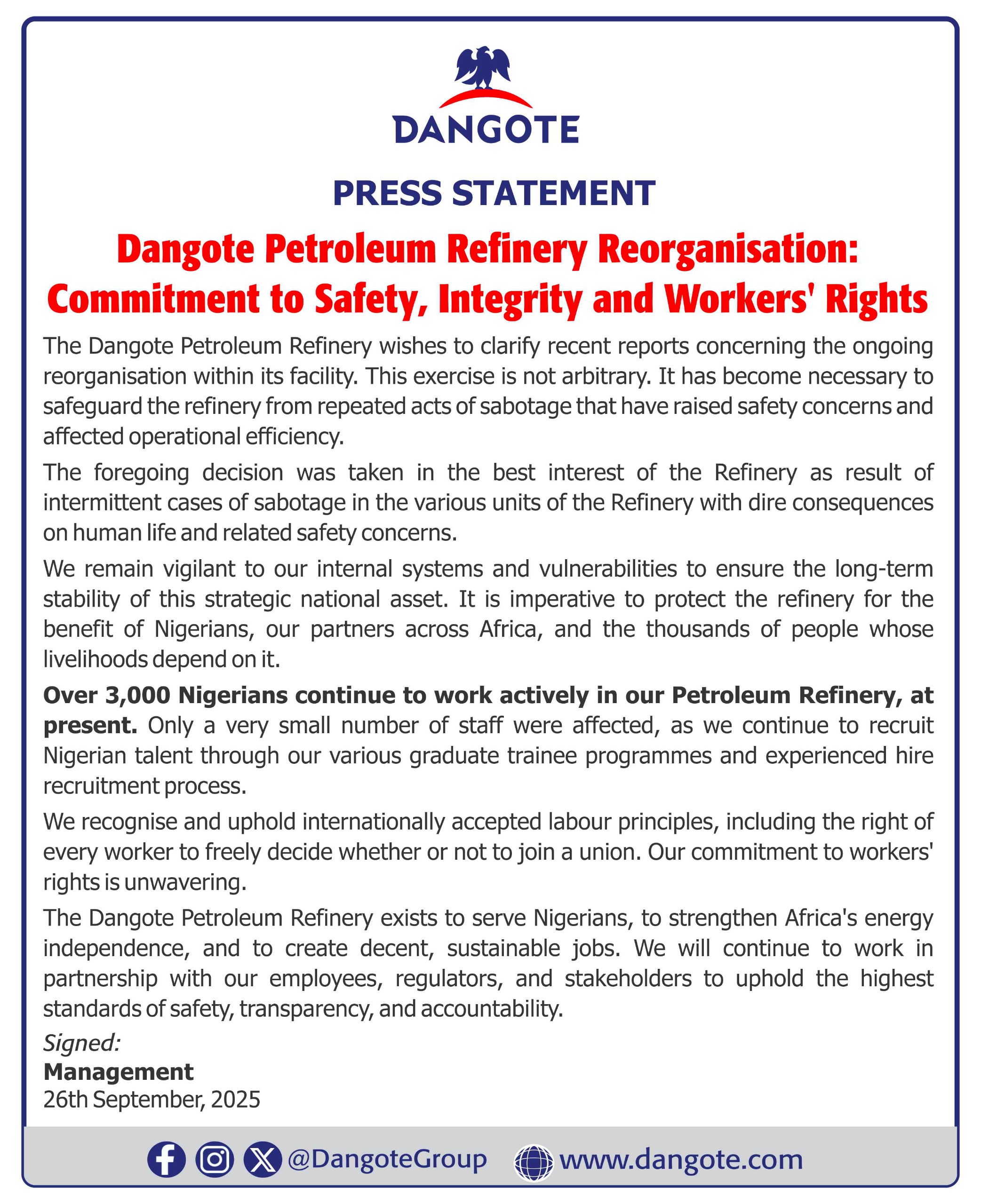 “The foregoing decision was taken in the best interest of the Refinery as a result of intermittent cases of sabotage in the various units of the Refinery with dire consequences on human life and related safety concerns. We remain vigilant to our internal systems and vulnerabilities to ensure the long-term stability of this strategic national asset. It is imperative to protect the refinery for the benefit of Nigerians, our partners across Africa, and the thousands of people whose livelihoods depend on it,” the statement noted.