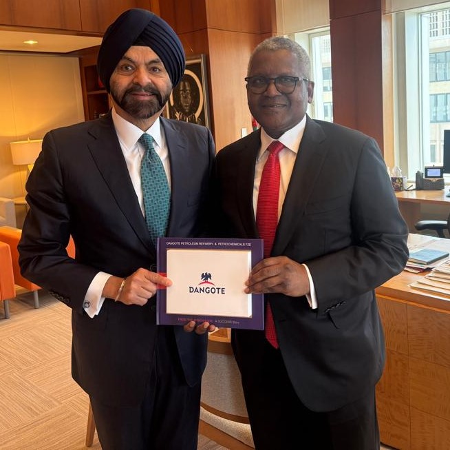 The President/Chief Executive of Dangote Industries Limited, Aliko Dangote (right) presenting a souvenir to the President of World Bank Group, Mr. Ajay Banga, during a meeting in his office at the side of the IMF/WBG Spring Meetings in Washington DC, the United States (U.S.).