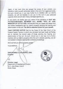 Since the Director of Department of Development was not a party to the suit haven sued his principal, the Minister of FCT, we deemed it wise to also notify him of the pendency of the suit via a letter received in his office on 4th July, 2023, attaching the Writ of Summons. The letter was also copied to the Director of Legal Services in his Department. For the Department to have proceeded to demolishing the entire structure while Suit No: FCT/HC/CV/6616/2023 on the subject-matter was pending is reckless and beyond the powers of the Minister of the FCT.