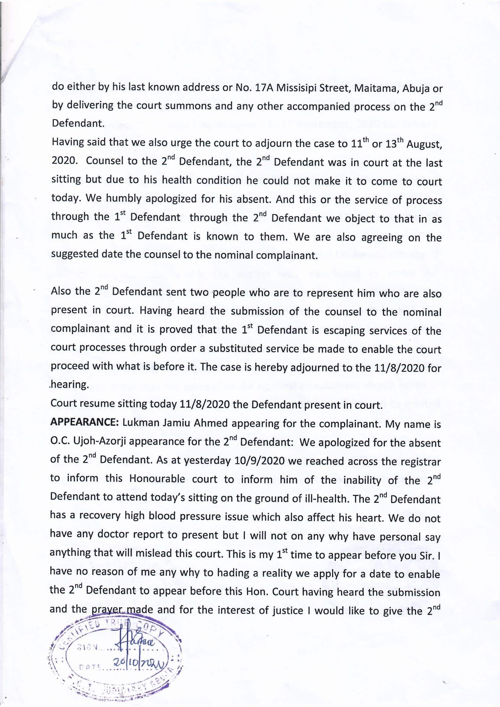When our client commenced the development of the Plot including the renovation of the existing guest house, a certain Abuja based legal practitioner took out a Direct Criminal Complaint against our client at the Grade 1 Area Court, Abuja for trespass, claiming that the property belonged to Oyebade Lipede, the late Alake of Egbaland. The suit was dismissed on 1/9/2020 with the Grade 1 Area Court Judge specifically urging the parties to refer the matter to FCT High Court since it has become issue of title to land (CTC of Ruling attached).