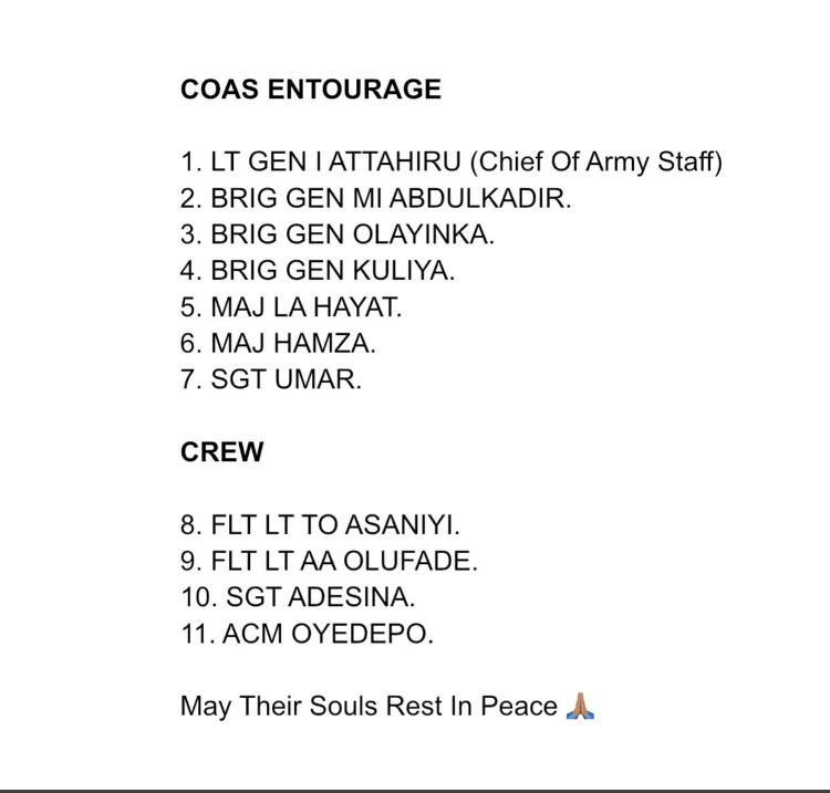 “As we pray for the repose of the souls of our gallant and committed Chief of Army Staff and other personnel on board with him, the AFN solicits the support and understanding of all Nigerians in the face of this tragic incident.