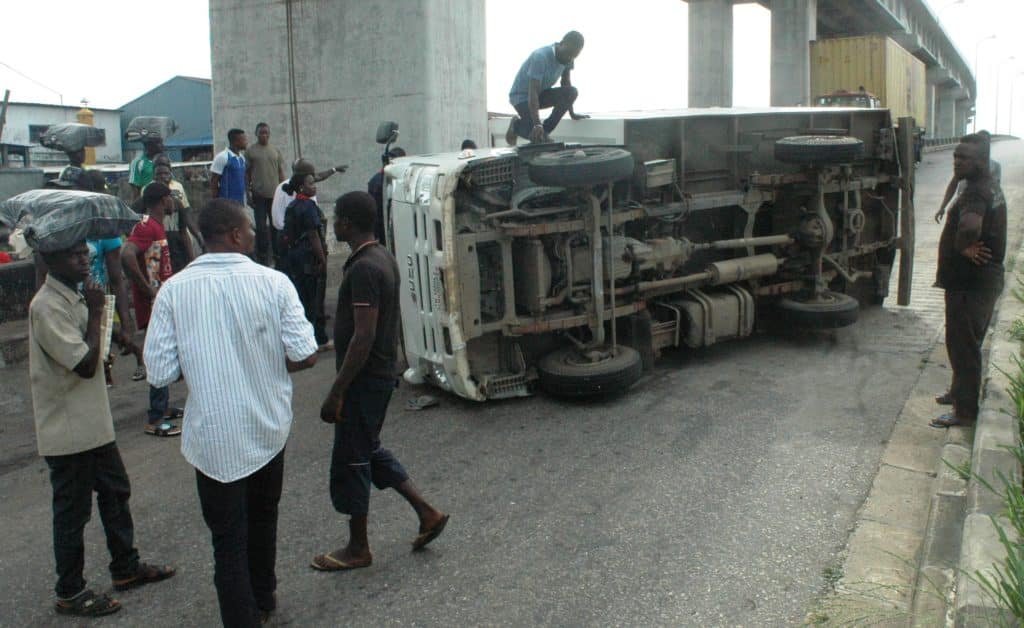 The driver of a sales van belonging to Euro Mega Atlantic Company, Ikeja, Lagos, on Wednesday, escaped death when his vehicle fell on its side on the Ijora/Orile overhead bridge, close to the National Theatre, Iganmu.