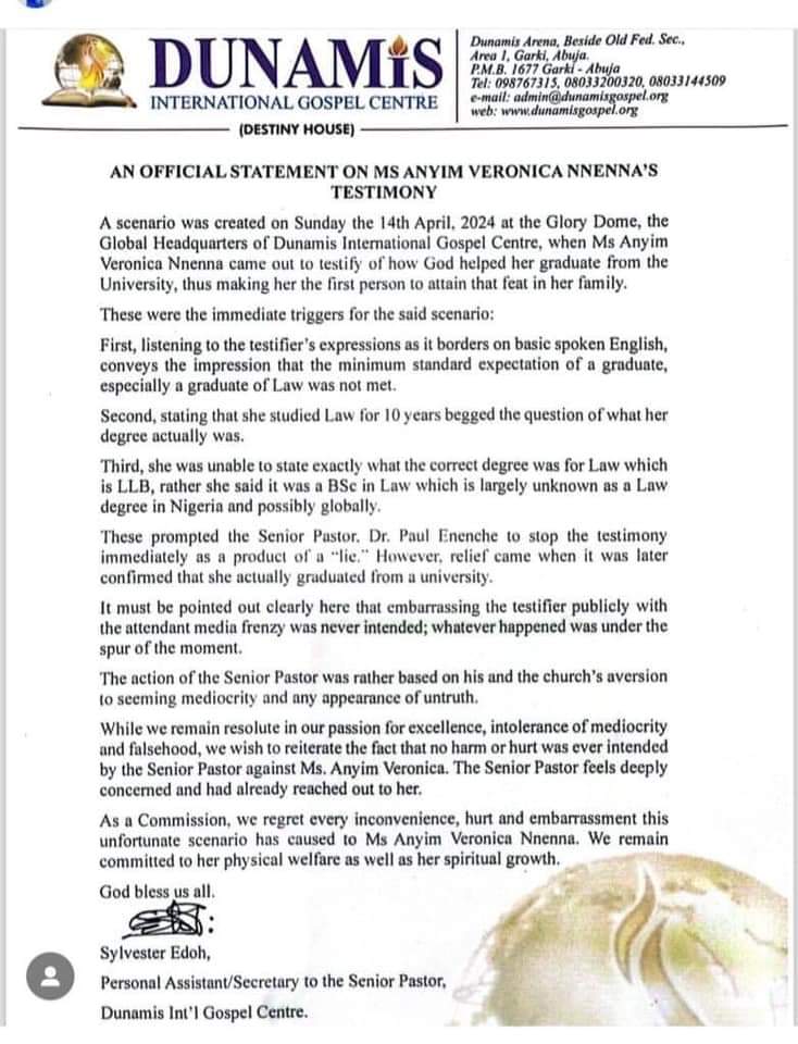 In its reaction to what was seen as a public embarrassment to Ms. Anyim Veronica Nnenna, Dunamis International Gospel Centre (Dunamis Church), on Monday, said that its Senior Pastor, Paul Enenche, had already reached out to her.