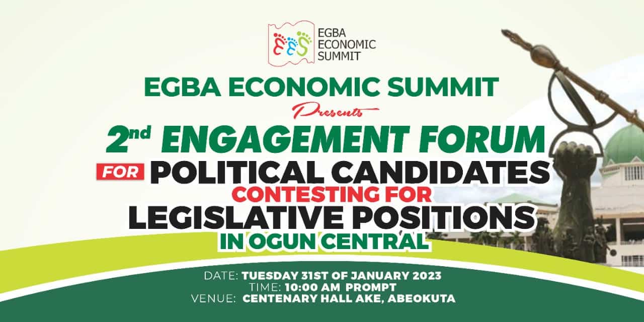 An engagement forum organised for party Legislative candidates in Ogun Central by the Egba Economic Summit (EES) holds on Tuesday, 31st January, 2023 at the Centenary Hall, Abeokuta beginning from 10 in the morning.