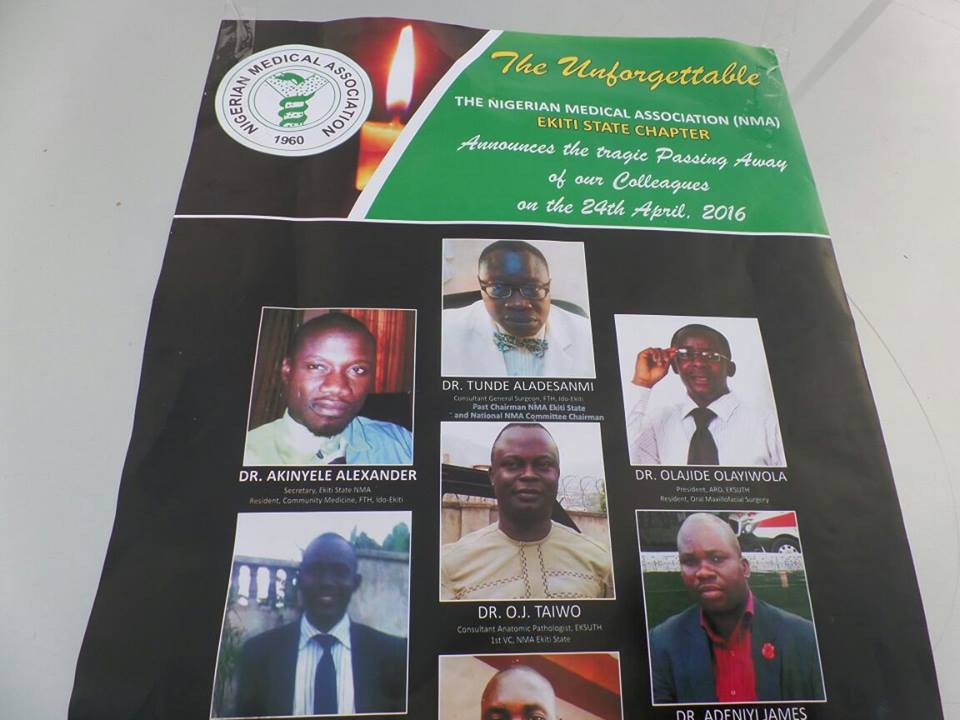 A poster with photographs of the six doctors and driver from Ekiti State, who died on Sunday in Kaduna on their way to Sokoto, on display in Ado-Ekiti…on Tuesday.
