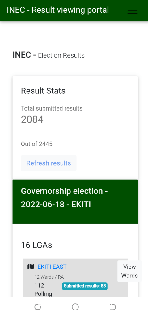 It also indicated that results from 84 out of the 112 polling units in Ekiti East Local Government; 177 polling units out of the 145 polling units in Ijero Council Area and 104 polling units out of the 125 polling units in Ikere Local Government had been uploaded.