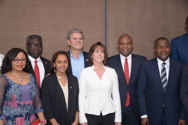 Chairman, Heirs Holdings, Mr. Tony O. Elumelu (second right); President, Dangote Group, Alhaji Aliko Dangote (right); CEO Famfa Oil, Mrs Folorunsho Alakija (left), MD/CEO, UBA, Mr. Phillips Oduoza (second left) and CEO Tony Elumelu Foundation, Mrs. Parminder Vir (third left) at a gathering of Nigerian business leaders hosted by Elumelu to discuss entrepreneurship and investment opportunities in Nigeria with Steve Case, American billionaire, founder of America Online, and one of President Obama’s Ambassadors for Global Entrepreneurship and his wife Jean Case, CEO of the Case Foundation at Heirs Place, Lagos…on Wednesday.